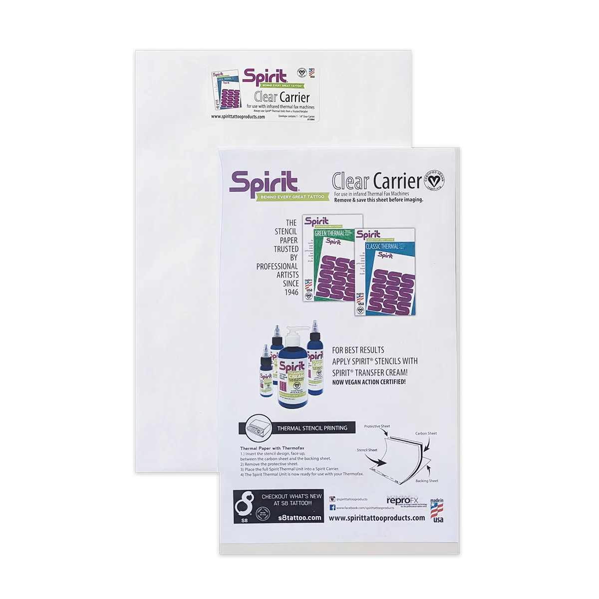 Our Spirit® Carriers have been developed to improve the quality of "burns" on thermal style transfer machines by evenly spreading thermal energy over the entire Spirit® Thermal Transfer Paper. Many old machines- like the 3M Secretary- develop hotspots as they get older; our Carriers have been proven to reduce over- and underexposure on these machines, allowing tattoo artists to get even and clear stencils every time.